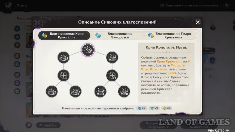 Элементами текущего сезона являются Гидро, Крио и Гео, поэтому за исключением особых гостей, вы можете выбирать персонажей только с соответствующим Глазом Бога. Не забывайте размещать собственных героев с нужными стихиями на доске поддержки, чтобы при необходимости их могли добавить к себе другие игроки.