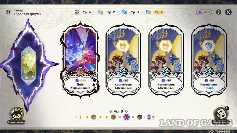 - Карта компаньонов – за обозначенное число Цветков Фантазии можно вызвать одного из ожидающих в запасе союзников, который вступит в строй с 2-я стаками Усердия;