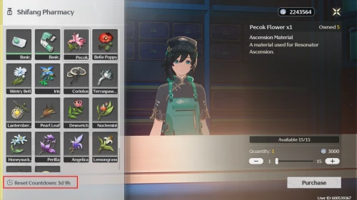 В аптеке у Шифан (Shifang Pharmacy), расположенной в Цзиньчжоу (Jinzhou), можно приобрести 15 Pecok Flower. За каждый из них придется отдать 3000 кредитов. Время до обновления ассортимента магазина указано в нижней части экрана.