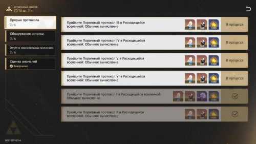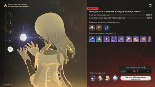 Является постоянным режимом. Разведку в нем можно пройти на пяти различных сложностях. Стоит отметить, что при достижении высокого Уровня Равновесия и выборе слишком простого испытания вы не получите очки аппроксимации и другие награды Виртуальной вселенной. Если же вам наоборот хочется проверить своих бойцов в более жестких условиях, то вы можете запустить Пороговый протокол. За первое прохождения каждого уровня сложности вы будете получать дополнительные награды.