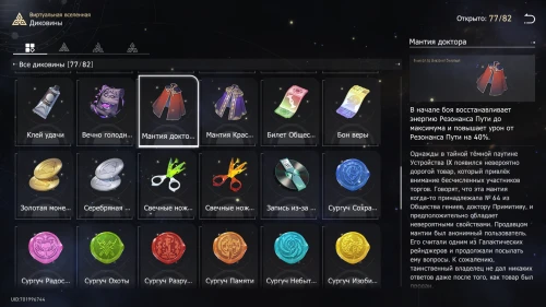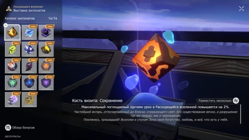 - В зоне экспонатов вы сможете выставлять объекты, полученные за прохождение различных режимов Виртуальной и Расходящейся вселенных. Каждый выставленный предмет будет давать определенные усиления, облегчающие испытания.