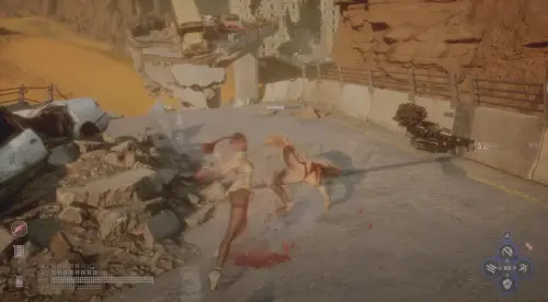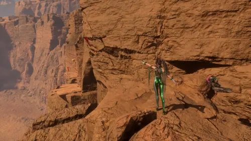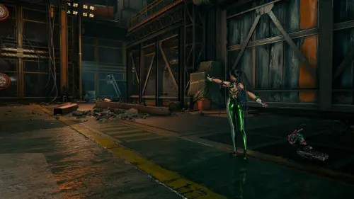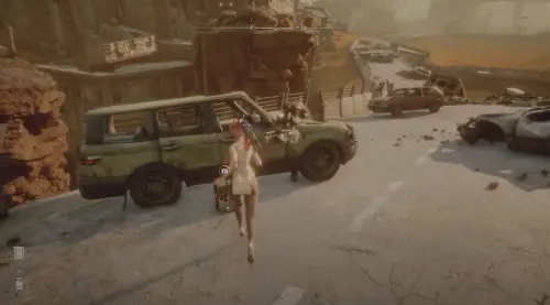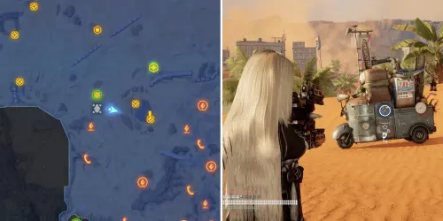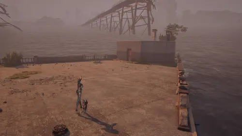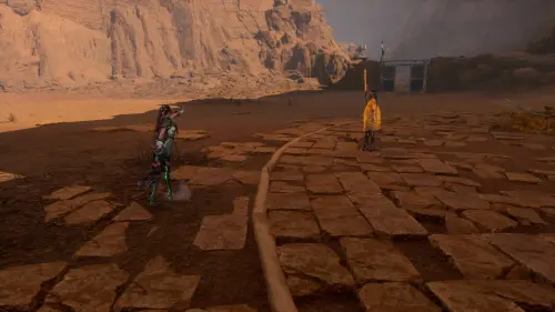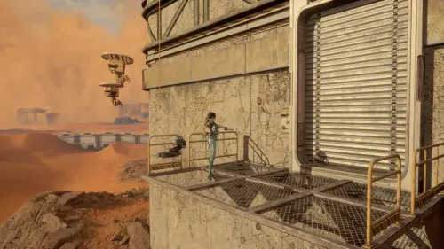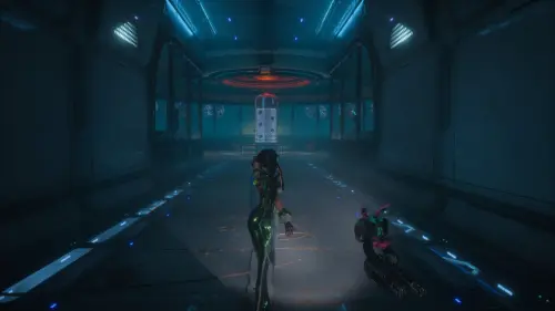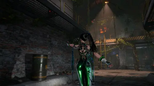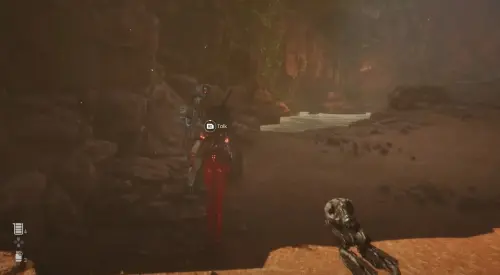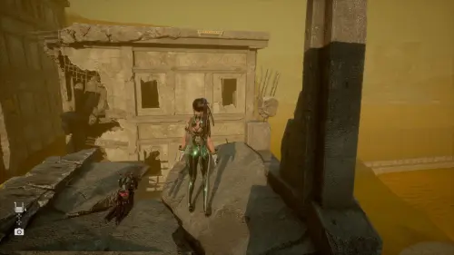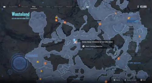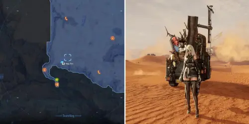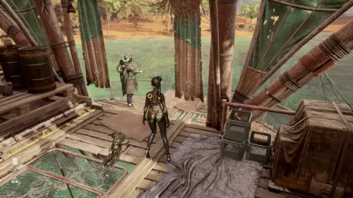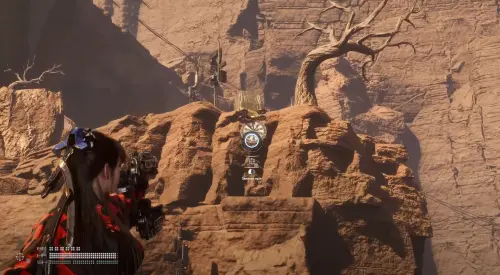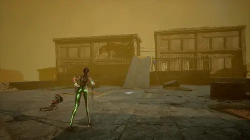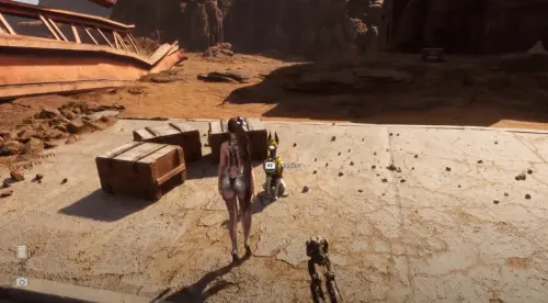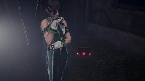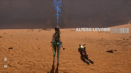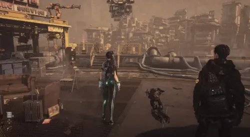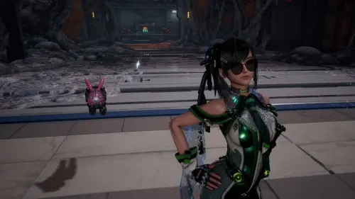 Отправляйтесь в северную часть отмеченной области и отыщите здесь механического пса по имени Вольт, являющийся частью дополнения Nikke. Гляньте небольшую кат-сцену, после чего вам откроется доступ к новому магазину – для этого нужно просто снова взаимодействовать с собакой. Необходимый вам наряд обойдется в 1 костный ключ. Эта новая валюта добывается путем прохождения побочных квестов DLC.