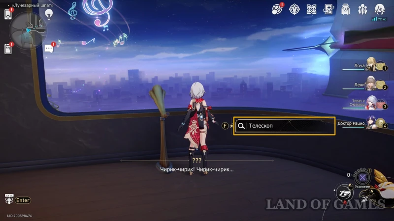 Переместитесь к якорю «Бассейн на корме» и бегите вперед до лифта. Подниметесь на 2-й этаж, затем бегите влево, до конца коридора – вы упретесь в площадку перед двигателем, на которой стоит телескоп (здесь же можно опустошить обычный сундук № 6 из нашего отдельного гайда). Воспользуйтесь этим оптическим прибором.