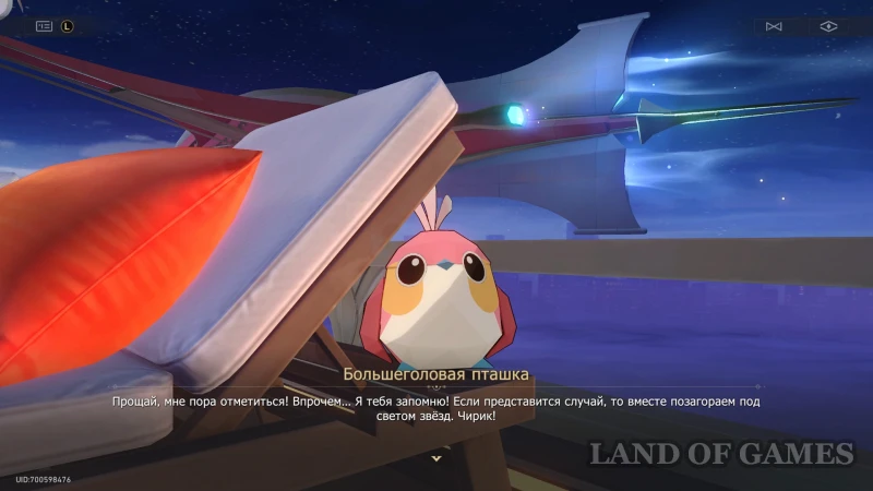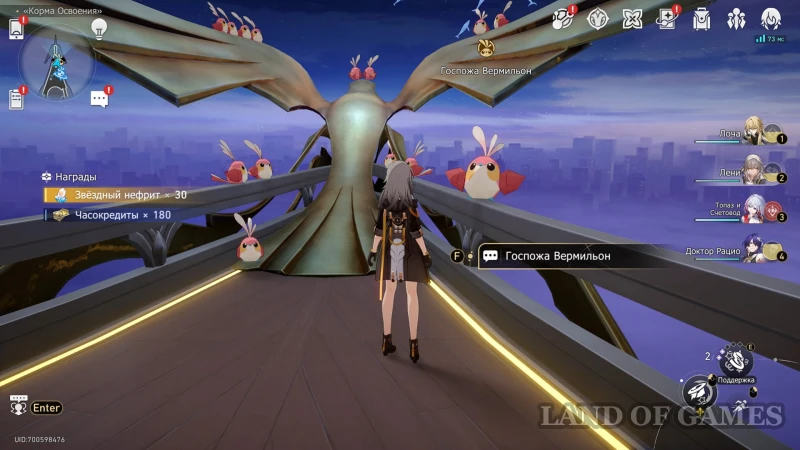 Когда все существа будут обнаружены, дойдите до большого гнезда Госпожи Вермильон на носовой части Лучезарного шпата — эта важная персона поблагодарит нас и вручит 30 нефрита, а также 180 Часокредитов.