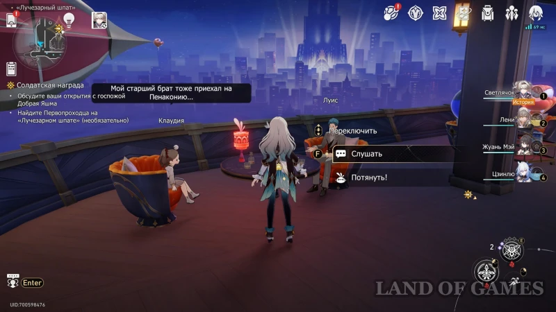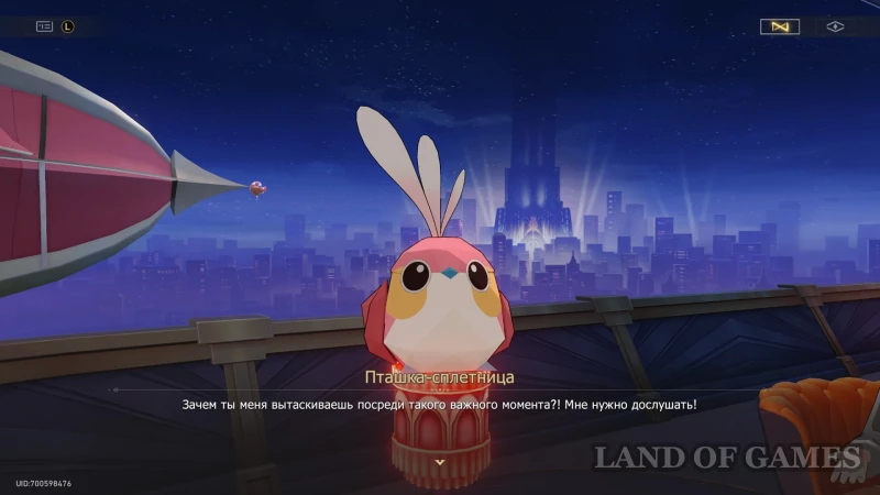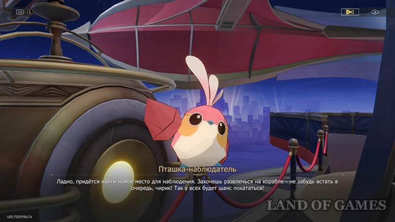 Далее поднимаемся на 2-й ярус элитного дирижабля: у западного края судна стоит обеденный столик, занятый Луисом и Клаудией — на нем находится притаившаяся в лампе птичка-сплетница.