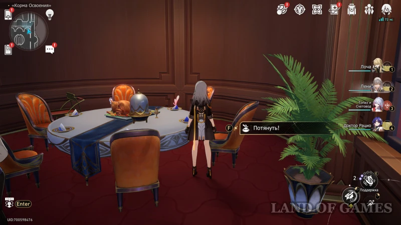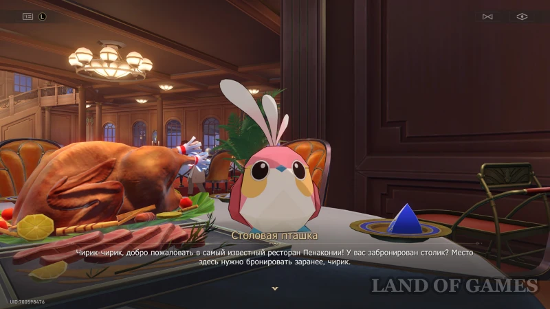От предыдущего места пройдите через ближайший проем в банкетный зал на 1 этаже. В северо-восточном углу, справа от входа, стоит круглый стол. С него можно вытянуть Столовую птичку-оригами.