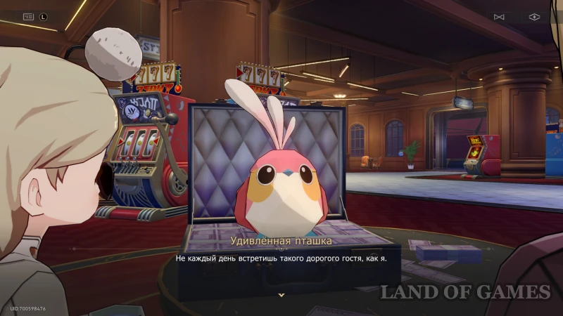 Предпоследнее существо можно найти в игральном зале на 2-м этаже корабля — удивленная птичка расположилась в денежном кейсе, стоящем за столиком в северо-восточном углу помещения.