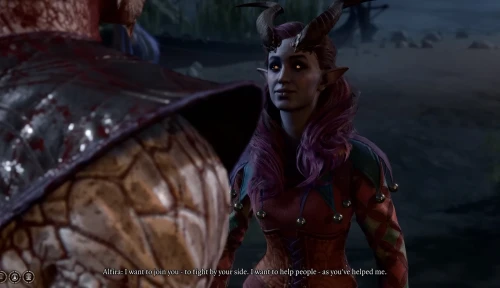Если вы не хотите убивать Альфиру, есть один вариант как оставить ее в живых. Как только вы первый раз посетите Лагерь гоблинов, сохранитесь, не уходя на долгий отдых. Вернитесь в Рощу и вырубите Альфиру несмертельной атакой. Уровень отношения Альфиры к вам снизится и на долгом отдыхе вместо нее придет другой бард — драконорожденная Квил Грутсланг.