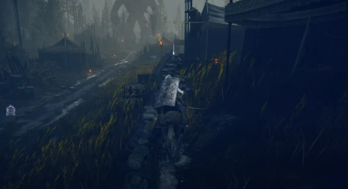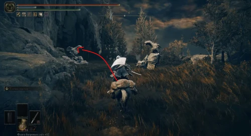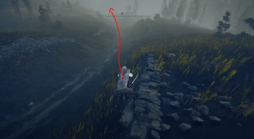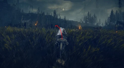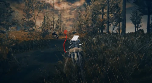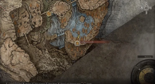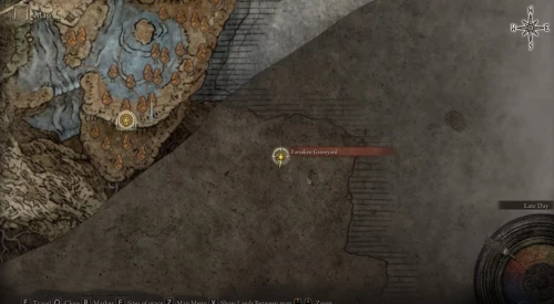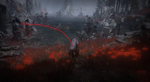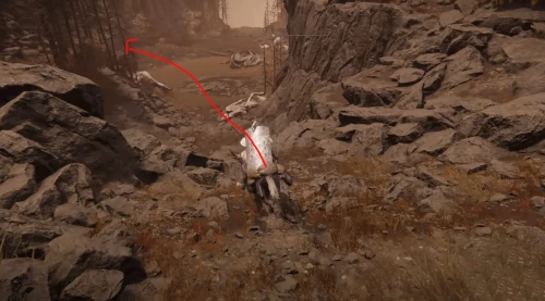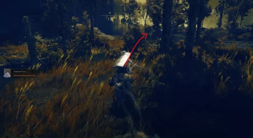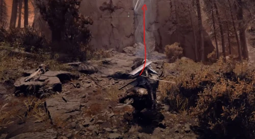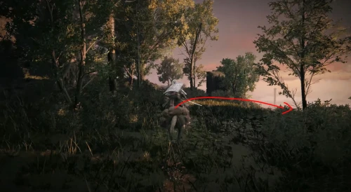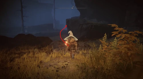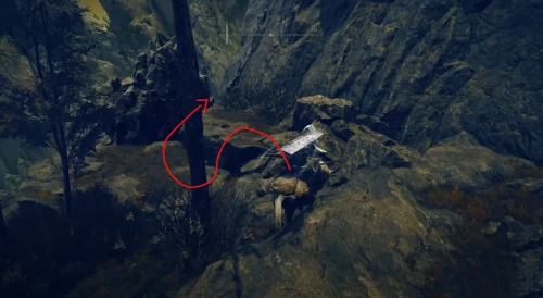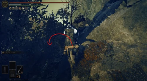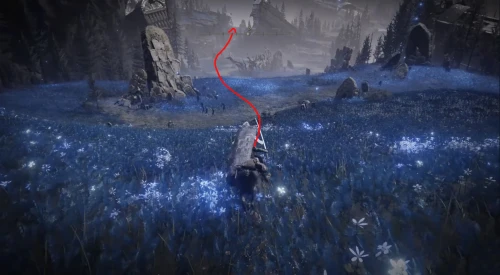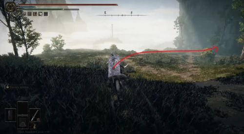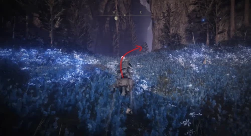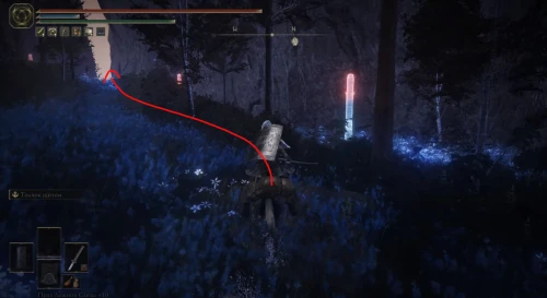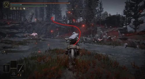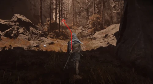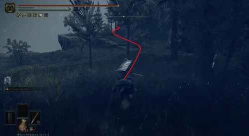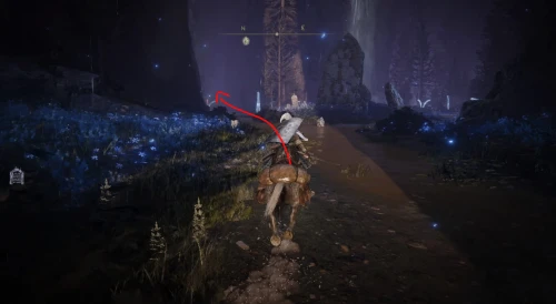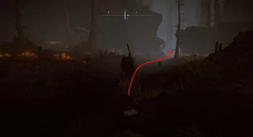 Активируйте место благодати «Забытое кладбище», пройдите через каменную арку и бегите на юг. Спуститесь со склона и отыщите второй «костер» рядом с большим деревом под названием «Лесная тропа». Затем начните идти на юго-восток к ущелью впереди.