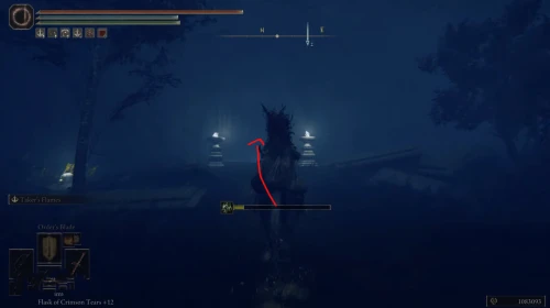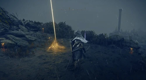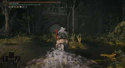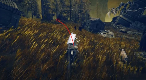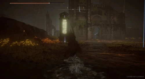 От предыдущего «костра» скачите на север по дороге, пока не доберетесь до вражеского лагеря. Здесь возле разрушенной стены вы найдете статую Марики, у подножья которой лежит требуемая вам вещица. Будьте осторожны, так как рядом бродит огненный голем.