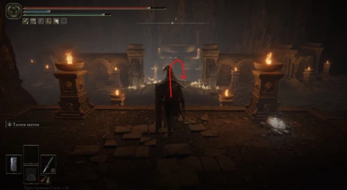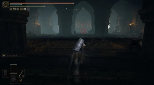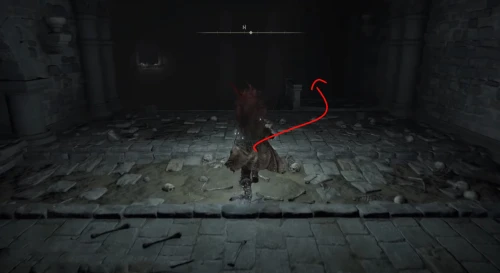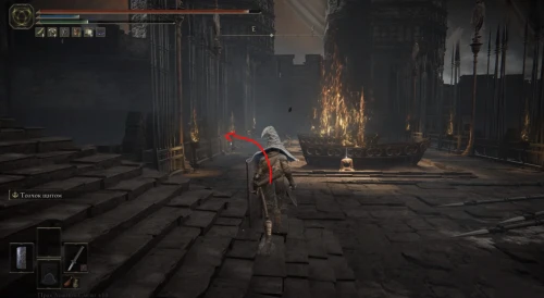 Двигайтесь в северо-западном направлении, пока не упретесь в стену, а затем сверните вправо. Дойдя до двери, поверните налево. Оказавшись в просторном помещении с чашей огня, спрыгните через дыру на нижний уровень здания.