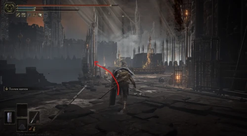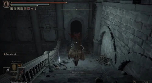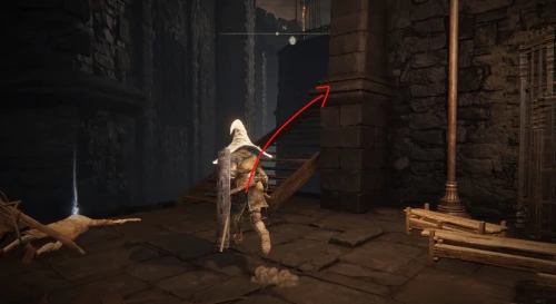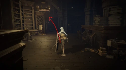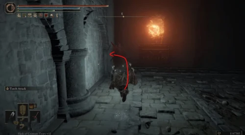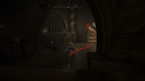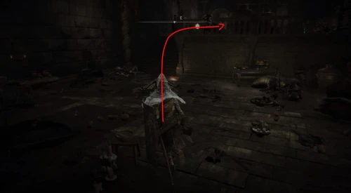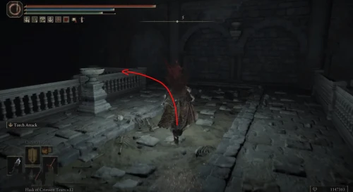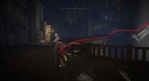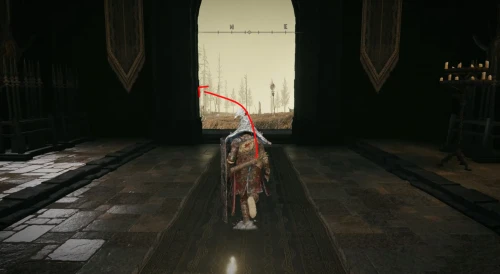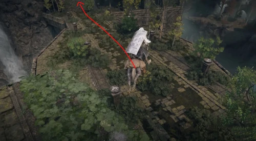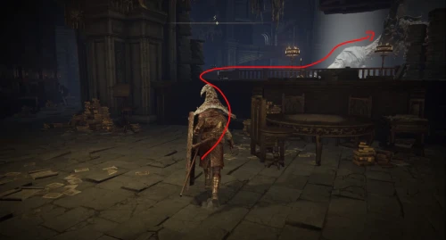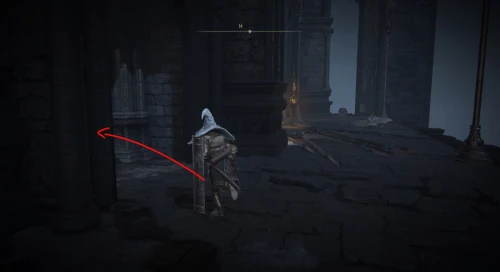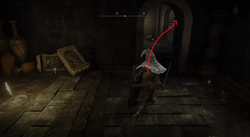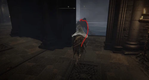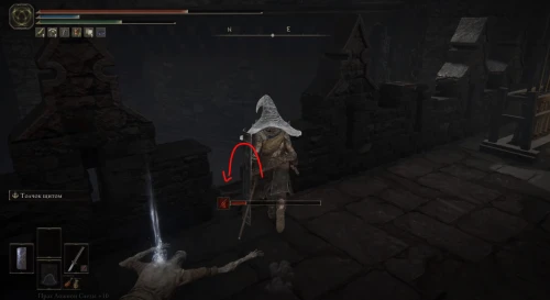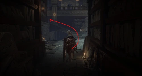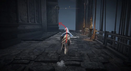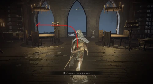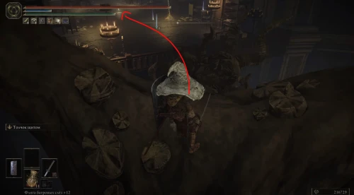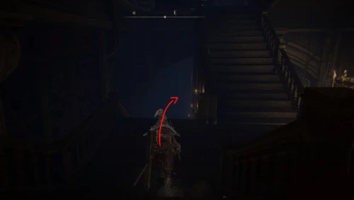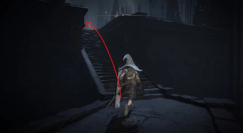 Вам нужно будет сначала добраться до места благодати «Хранилище, первый этаж». Для этого дойдите до «Площади перед главными воротами», а затем пройдите через проход на северо-западе, поднимитесь по ступенькам и сверните вправо к деревянной лестнице. Взберитесь по ней еще выше.