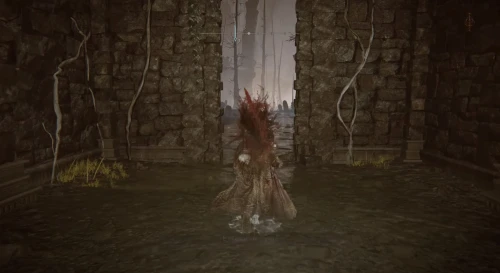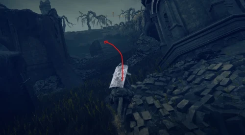 Бегите вперед и пройдите еще под двумя каменными арками, чтобы выйти на открытую область. Пройдите мимо полуразрушенной колонны и подойдите к кресту Марики, возле которого будет лежать фрагмент. Здесь также находится место благодати «Руины обители Рауха, восток».