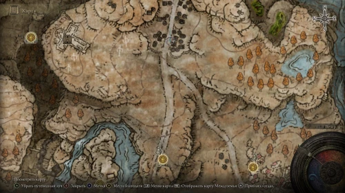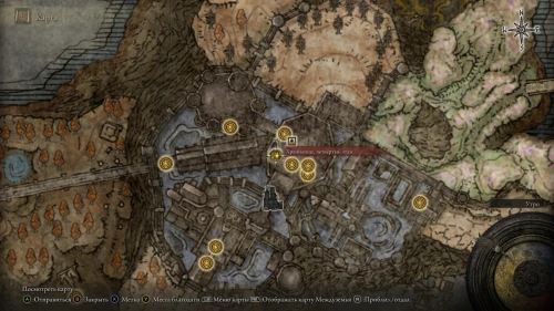 Продолжайте двигаться по тропе в юго-восточном направлении, и вскоре вы обнаружите впереди Путеводную стелу рядом с полуразрушенным зданием. Забрав карту области, войдите внутрь сооружения, активируйте место благодати «Церковные руины» и подберите сразу два фрагмента, лежащих у постамента, где должна была стоять статуя Марики.