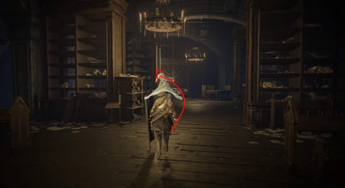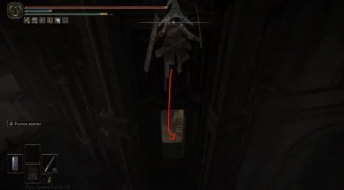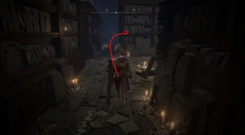Бегите вперед и резко развернитесь вправо после второй полки. Поднимитесь по деревянной лестнице влево и воспользуйтесь второй лесенкой справа, чтобы подняться еще выше. Потом сверните вправо и запрыгните на висячую у потолка статую. Доберитесь до ее головы, а с нее спрыгните на площадку с местом благодати «Хранилище, четвертый этаж».