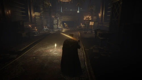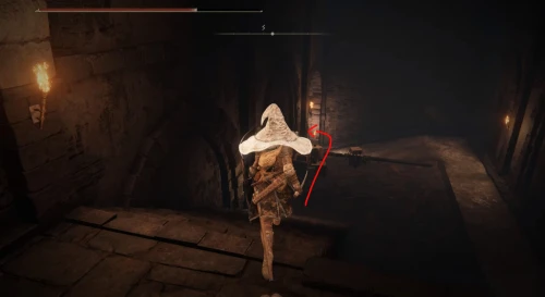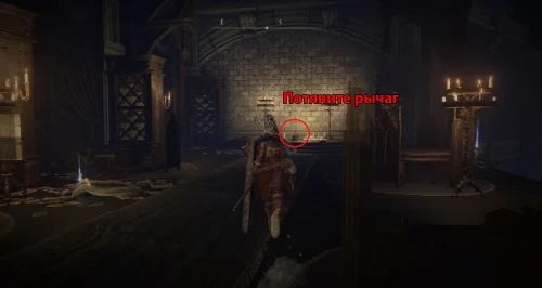 Активировав костер, развернитесь и спуститесь по лестнице вниз. Войдите в проход на юго-востоке и продолжайте бежать в указанном направлении, пока не упретесь в стену. Здесь взаимодействуйте с рычагом, чтобы повернуть балки в основном зале.