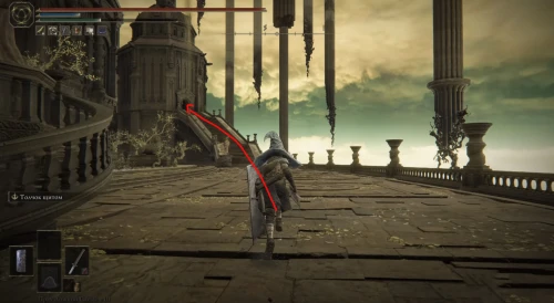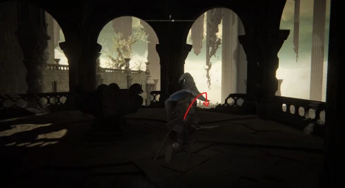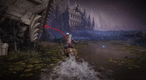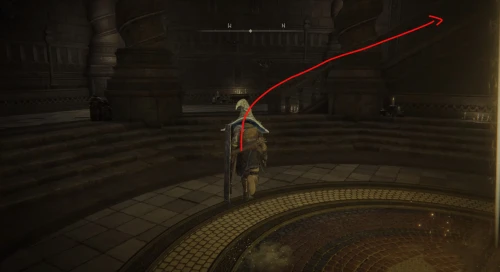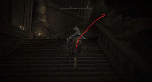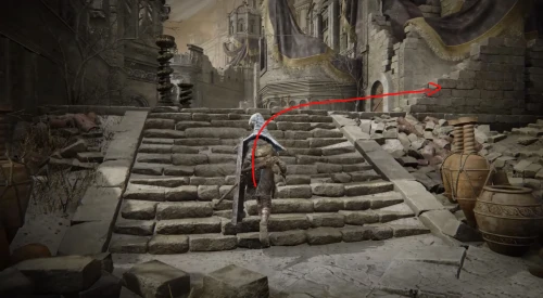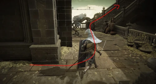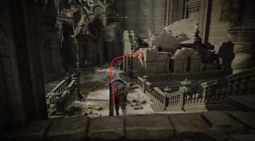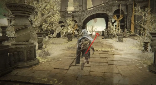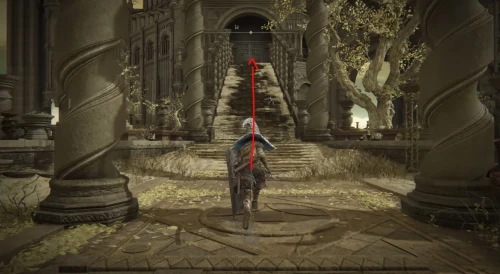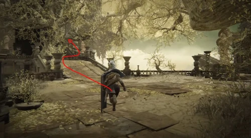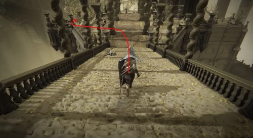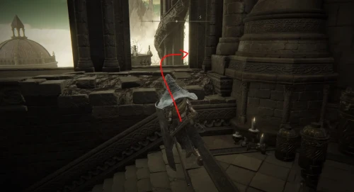 Переместитесь или доберитесь до места благодати «Первый подъем», а затем начните бежать на юго-запад и поднимитесь по лестнице наверх. Продолжайте бежать в том же направлении, перепрыгнув через разлом на другую площадку. Затем обойдите фонтан и поднимитесь по лестнице с левой стороны.