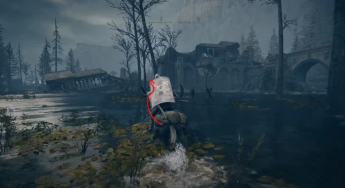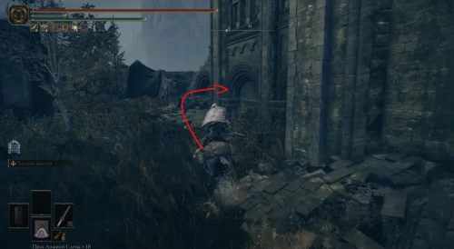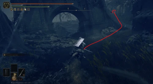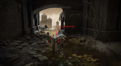 Вернитесь к месту благодати «Проход в церковный круг». Затем пройдите вперед, спрыгните на крышу затопленного здания и начните двигаться на северо-запад. Вам нужно будет перепрыгнуть на другую крышу, воспользовавшись козырьком и спринтом. Далее поверните направо, заберитесь по полуразрушенной стене наверх и перепрыгните на выступ справа.