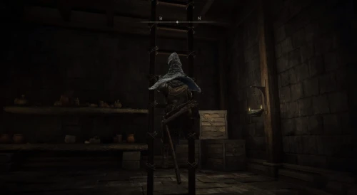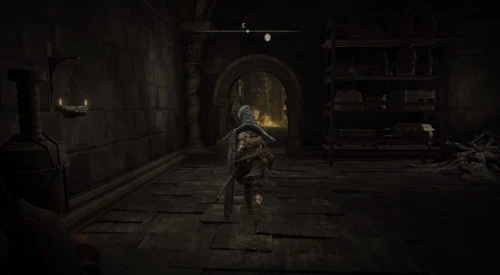 Поднявшись, сверните вправо и поднимитесь по ступенькам наверх. Далее пройдите между стеллажом и стеной справа, чтобы найти дыру в стенке – выйдите через нее наружу и тут же поверните направо. Бегите по деревянному помосту наверх и снова войдите в здание, чтобы активировать место благодати «Хранилище, чердак». Затем сразу же сядьте в деревянный лифт, который поднимет вас еще выше.