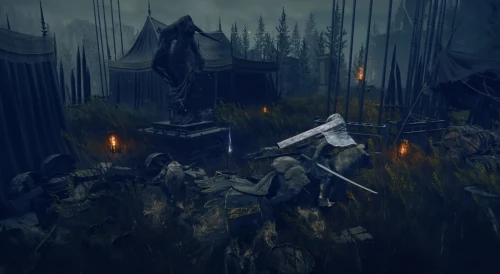 Снова переместитесь к предыдущему «костру», а затем скачите на северо-запад к вражескому лагерю. В центре него отыщите статую Марики, у подножья которой будет лежать нужный вам фрагмент.