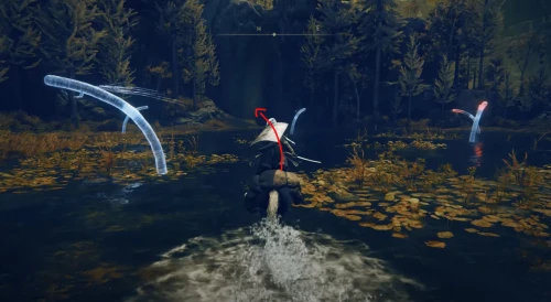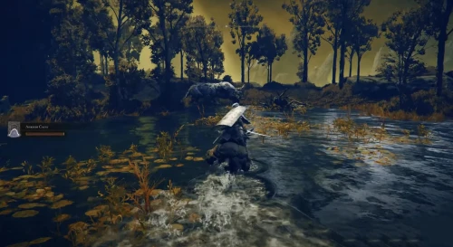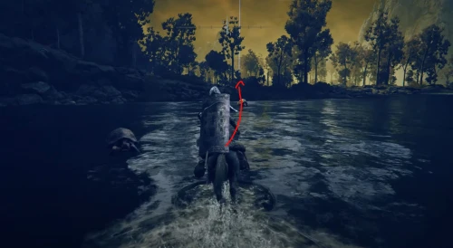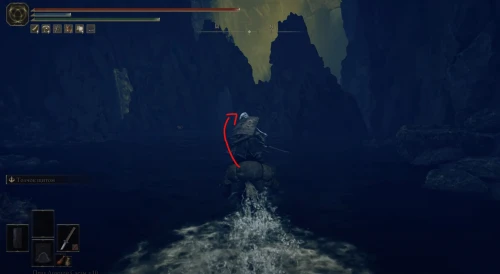 Вернитесь к месту благодати «Лесная тропа», а затем бегите на запад, спрыгнув с выступа вниз. Двигайтесь вперед по воде, пока не доберетесь до костра «Лес бездны». Затем поверните на север и идите вдоль скалы справа. Когда увидите на горе золотые прожилки, сверните влево, обходя бродящих тут монстров.