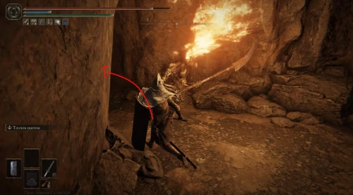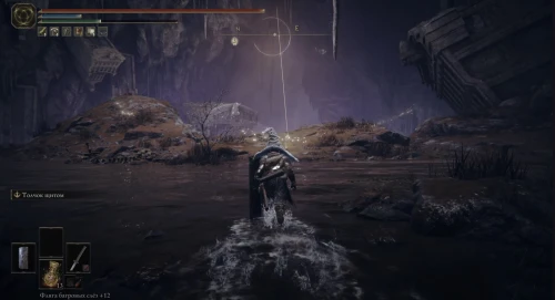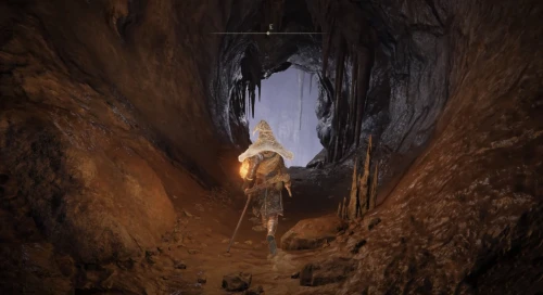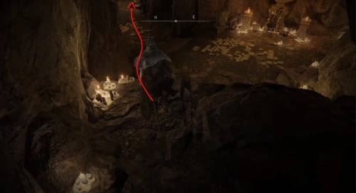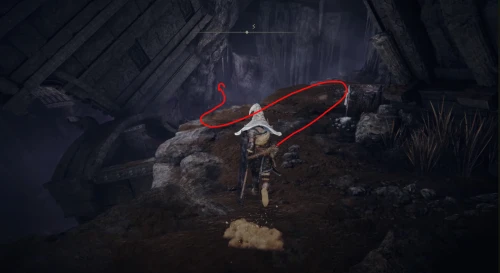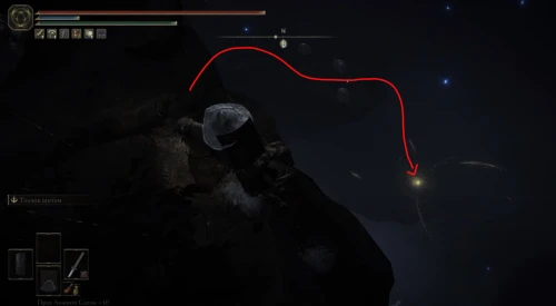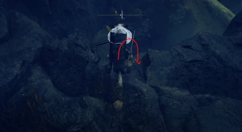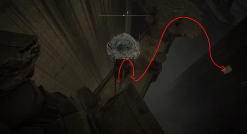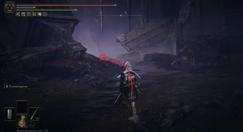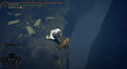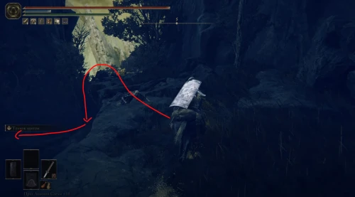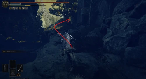 Далее начните двигаться на восток по темному туннелю, и вскоре вы окажитесь в просторной пещере «Разлом в каменном саркофаге» и найдите одноименное место благодати. От него начните спускаться вниз по выступам и руинам, продолжая двигаться в восточном направлении. Встаньте на краю утеса, чтобы свалиться в самый низ (не бойтесь, вы не умрете от падения).