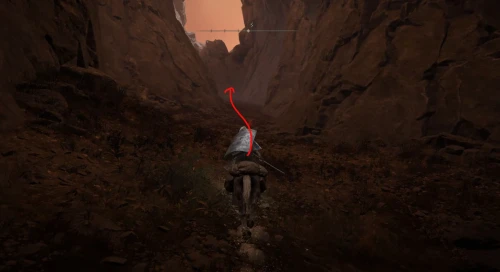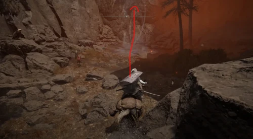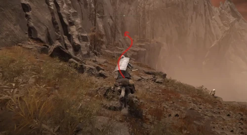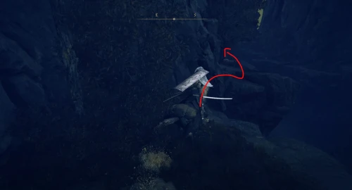Продолжайте бежать в южном направлении, а затем спрыгните на выступ слева в месте, показанном на скриншоте ниже. Теперь начните идти на северо-восток, перейдите на другую сторону ущелья и начните спускаться вниз, следуя за крестами. Добравшись до водопада, бегите направо по дну ущелья, пока не достигните второго водопада. Здесь отыщите открытый гроб и заберите с трупа фрагмент.