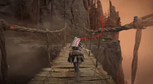 Поднявшись наверх, пересеките веревочный мост, двигаясь в юго-восточном направлении, и активируйте место благодати «Подножие зубатой горы». Поднявшись по горной тропке наверх, начните бежать на юго-восток, обойдя Дракона зубатой горы. Затем войдите в ущелье и воспользуйтесь еще двумя воздушными потоками.