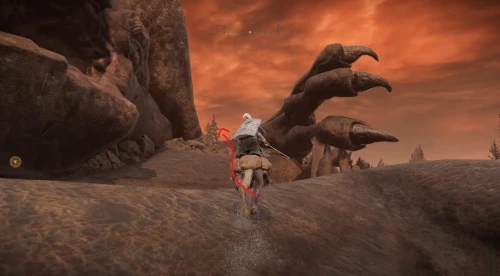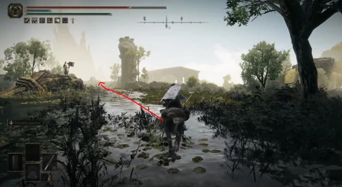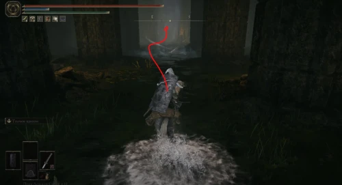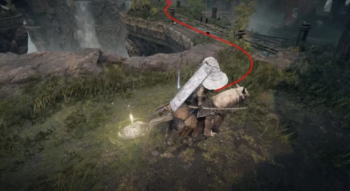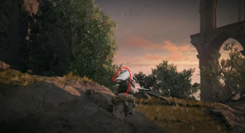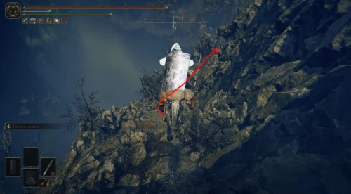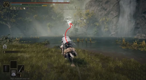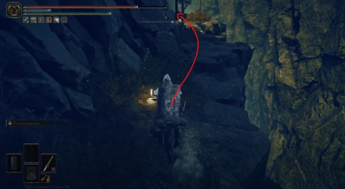 Посмотрев кат-сцену, пройдите через проход впереди и активируйте место благодати «Замковый водопой». Теперь просто скачите на юго-восток, чтобы попасть в Руины Унте и активировать костер «Верхний поток реки Аскетов». Далее бегите вдоль скалы на юг, перепрыгивая расщелины между выступами. Примерно через несколько секунд переберитесь на другую сторону ущелья.