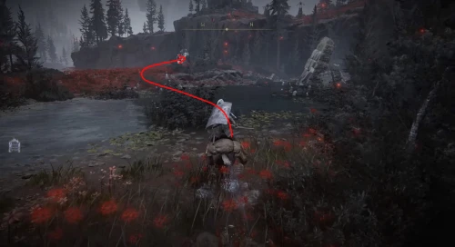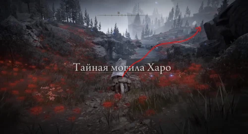 Спуститесь к водоему, а затем бегите вдоль водопадов, поднявшись по склону в северо-западном направлении. Оказавшись на красном цветочном поле, бегите к каменной арке впереди и активируйте по пути место благодати «Тайная могила Харо».