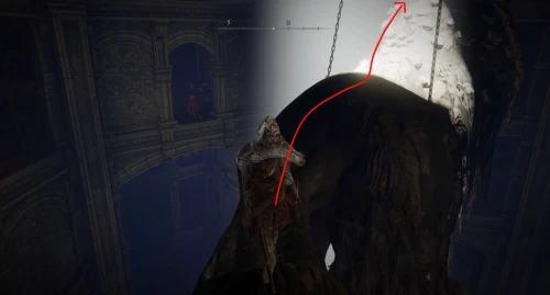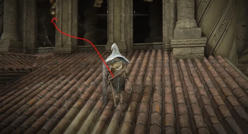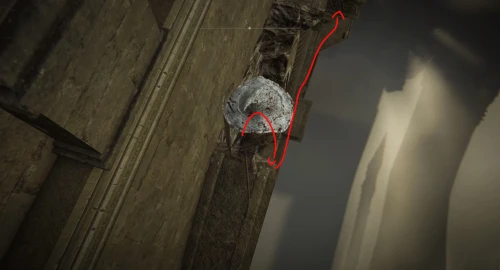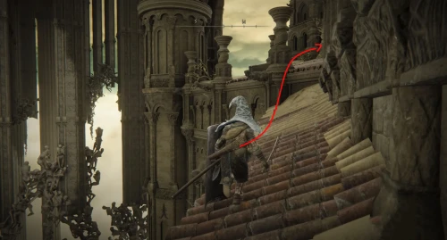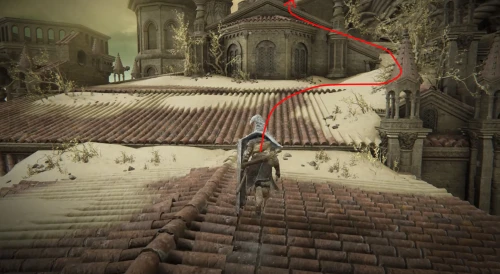 Вернитесь к месту благодати «Извилистый подъем», а потом начните подниматься по каменной лестнице. Через 3 больших пролета сверните влево и выпрыгните наружу через окошко, чтобы оказаться на крыше. Бегите по кровле на юго-запад, а затем на северо-запад, пока не доберетесь до площадки на другой стороне.
