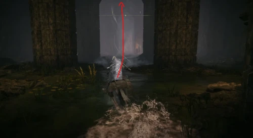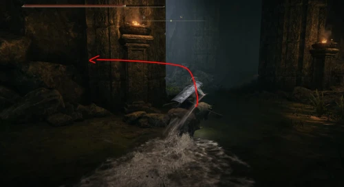 Оказавшись в здании, спрыгните в разлом на полу, чтобы попасть на этаж ниже. Теперь пройдите через проход на северо-западе и разберитесь с огненным рыцарем. Далее сверните вправо и прыгните на статую, торчащую из воды. На ее конце взаимодействуйте с белым огоньком, чтобы поднять еще один фрагмент.