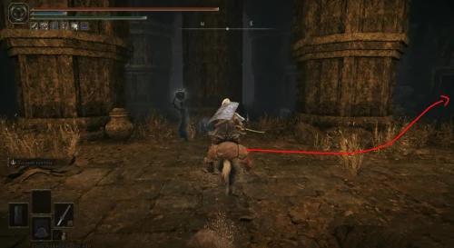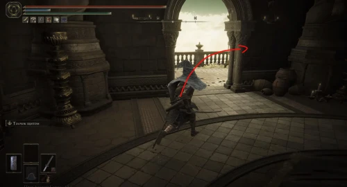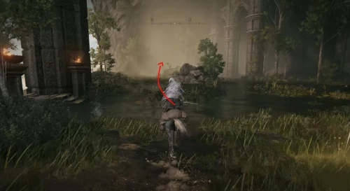 Доберитесь до Путеводной стелы, где находится карта Руин Рауха, а затем направляйтесь на юго-запад, пройдя мимо руин. Бегите по воде к следующим развалинам впереди. Обойдите здание и сверните вправо. Далее войдите в проем в стене и поднимитесь по лестнице наверх. Пройдите по красной ткани и спрыгните на балкончик внизу.