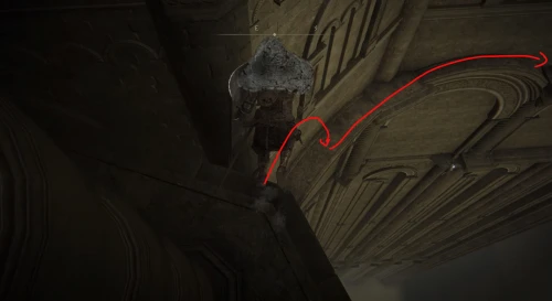 Переместитесь или доберитесь до места благодати «Извилистый подъем», расположенный в Энир-Илиме, а затем выйдите из здания через юго-восточный выход. Спуститесь по ступенькам вниз, поверните налево, когда доберетесь до площадки, и пройдите еще ниже по лесенке. Заверните в проход справа, пройдите к краю платформы и спрыгните на лестницу слева и внизу.