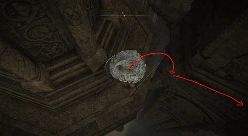 Дождитесь, пока балка не подъедет к балкончику, а потом спрыгните с него на нее. Заберитесь наверх по выступам и перейдите на балку слева с трупом животного. Далее запрыгните на статую справа, поднимитесь ей на голову и спуститесь на балкон внизу. Пройдите через комнату и выйдите наружу.