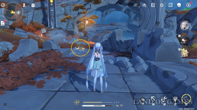 От 19-й ценности сверните влево и заберитесь по каменной стене в промежутке между двумя ближайшими телепортами: Ветряной колокольчик лежит в траве между рудой.