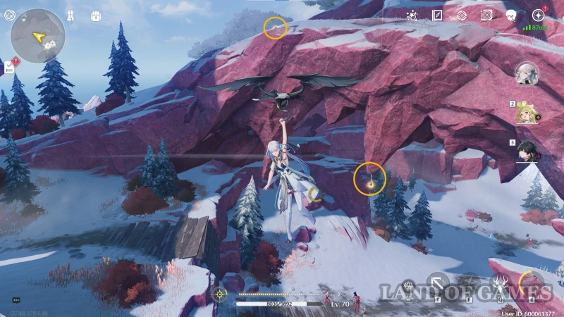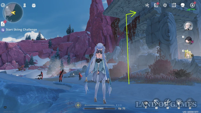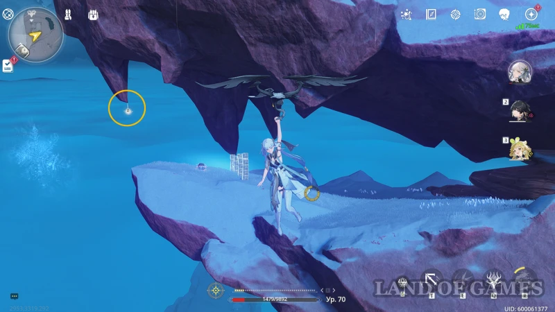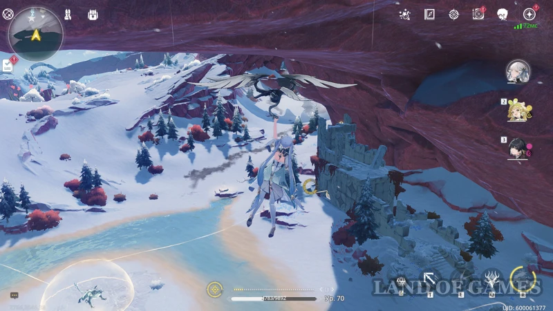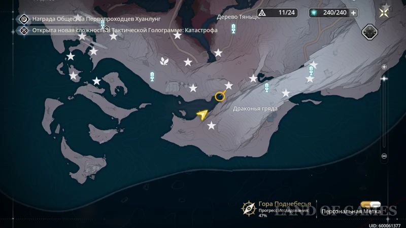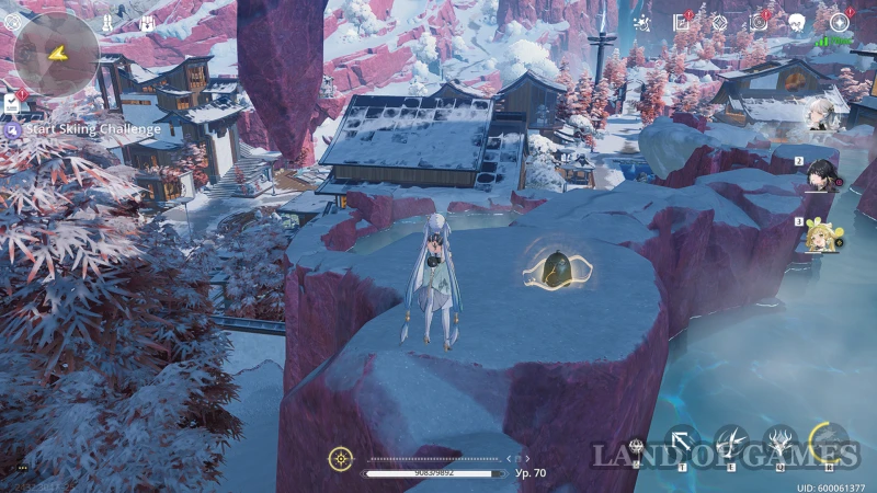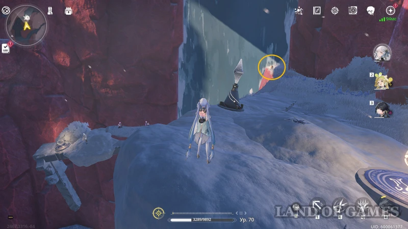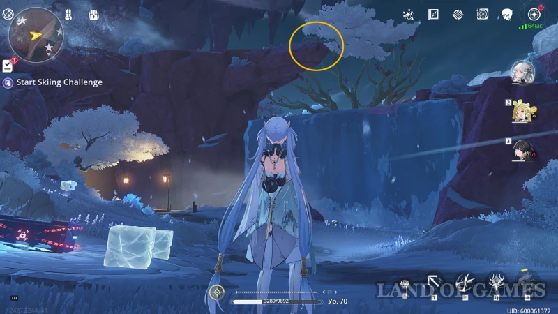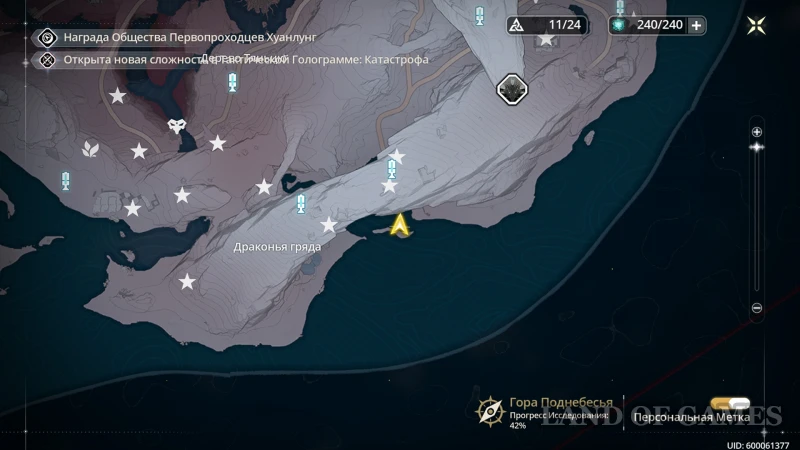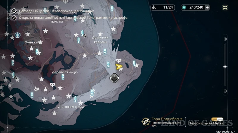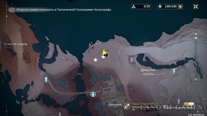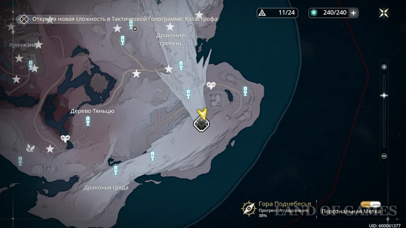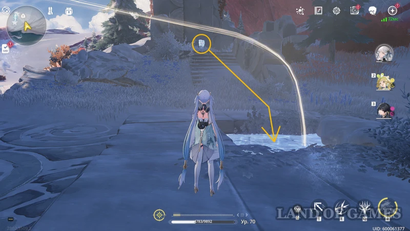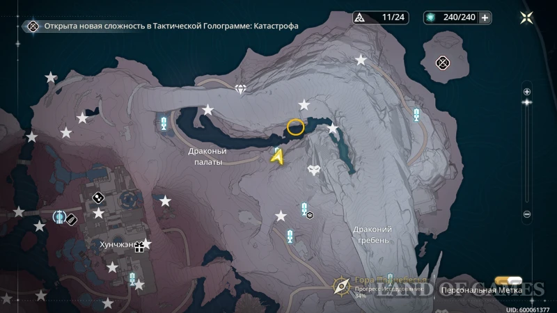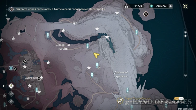 Далее поднимаемся к истоку водопада на северной стороне Драконьего гребня (Loong's Crest): колокольчик висит над вертикальным течением в отмеченном на скриншоте карты месте.