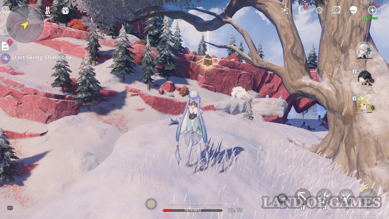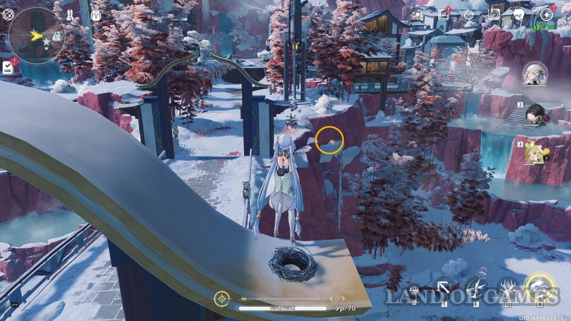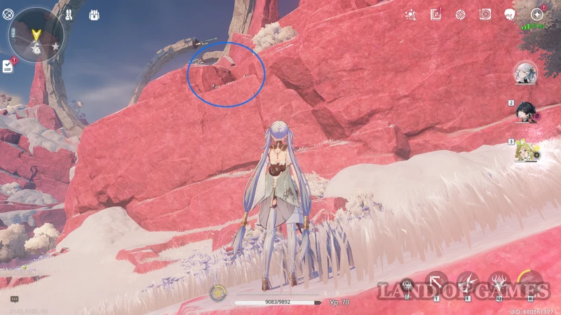 Вернитесь к Дереву Тяньцю и бегите на северо-запад, до окруженного водопадами углубления: на верхнем скриншоте отметили место в области, на котором получится найти еще один Ветряной колокольчик.