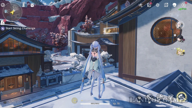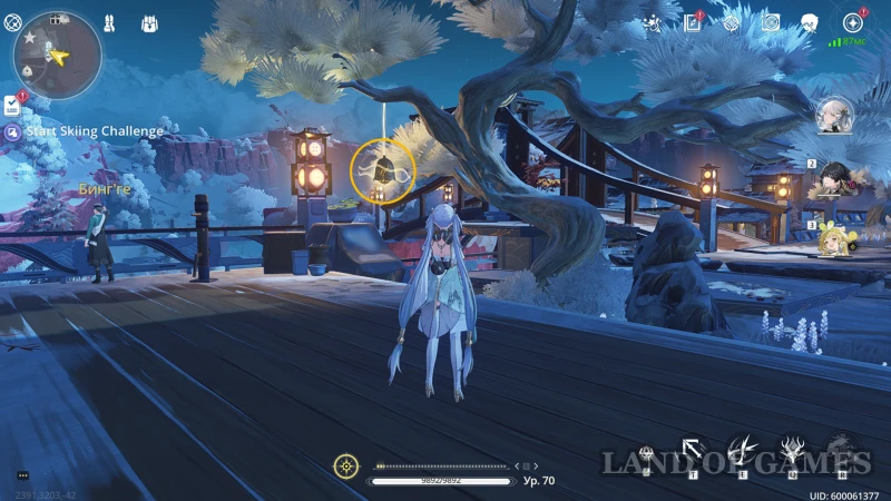 Вернемся в город: переместитесь к малому телепорту в южной части Хунчжэнь, поднимитесь на здание справа от места перемещения и снова пробегите в том же направлении: колокольчик прикреплен к изогнутому дереву, около которого стоит НПС Бинг'ге (Bing'ge).