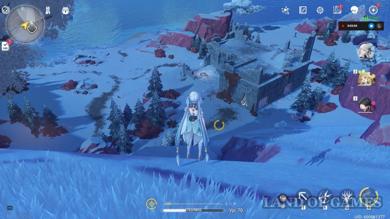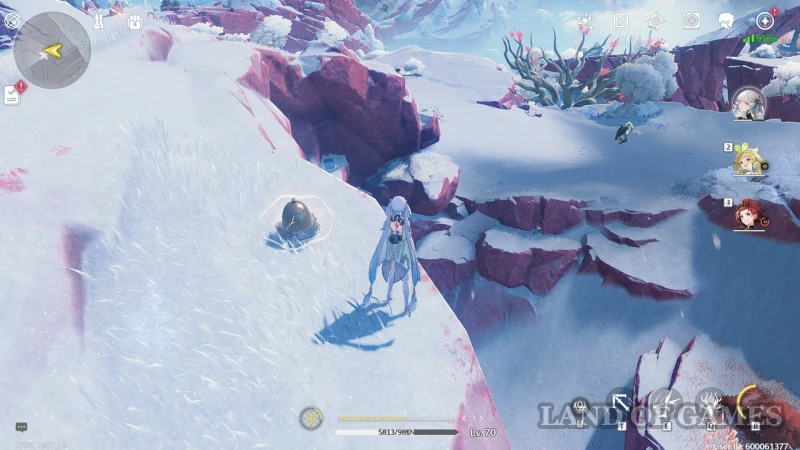 От прошлого места пройдите к крайнему островку у границы карты, на юге Горы Поднебесья: этот колокольчик лежит на верхушке обледенелого каменного здания (за выступающей несущей колонной).