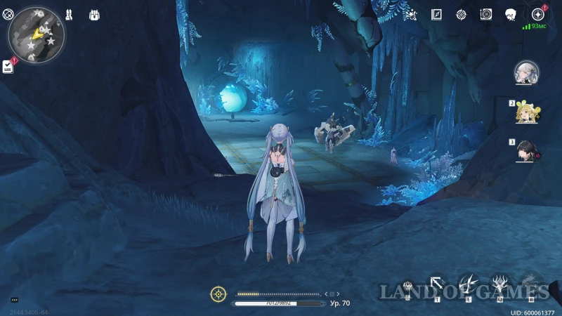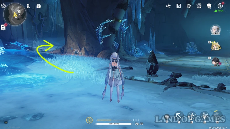 Двигайтесь в глубь области, до участка перед проходом в более крупную часть пещеры. Здесь, около группы монстров, вы увидите застрявший в земле округлый элемент, внутри которого лежит искомая реликвия.