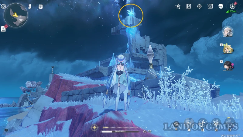 Далее спуститесь к побережью с восточной стороны от Драконьего гребня: мерцающая музыкальная реликвия лежит на среднем ярусе каменных развалин, перед которым расположились враждебные культисты.