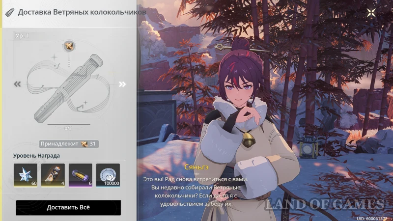 После того, как вы отдадите Сяньгэ весь объем Ветряных колокольчиков, девушка выдаст много ценных предметов, в числе которых будет пара конст на Ровера (Спектро элемента), расходные материалы, рецепты и 360 астритов (Astrite) — это по 60 за каждый уровень.