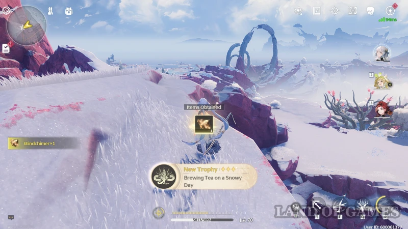 И последний трофей за сбор Ветряных колокольчиков — трехзвездочная ачивка «Brewing Tea on a Snowy Day» (Заваривание чая в снежный день). Ее дают за нахождение всех Windchimer на горе Поднебесья. Цена сбора в разделе Footprints of Huanglong II (Следы Хуанлуна II) — 20 астритов.