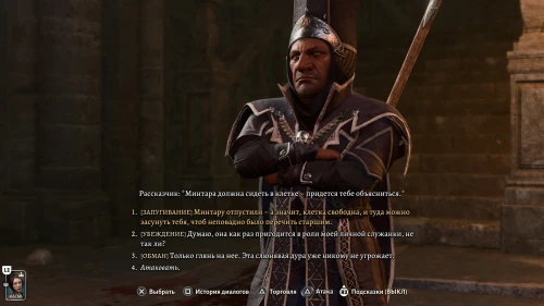 Если же вы выберите повлиять на самого Кетерика (21), то даже в случае прохождения проверки, из этого ничего не получится. Так как у него в мозгу нет ни личинки, ни психической энергии. Но его можно будет уговорить позже, выбрав «Не стоит ее убивать. Она верная слуга Абсолют», а затем «Она не врет, она действительно верно служила Абсолют». Кетерик скомандует отвести ее в тюрьму. И в журнале появится новое задание: «Проверить, как там Минтара».