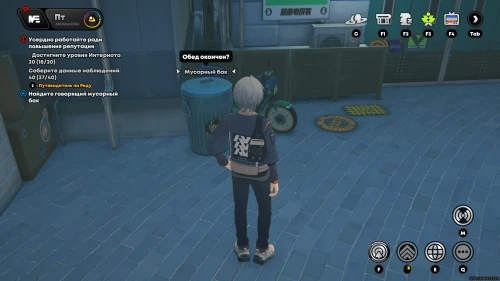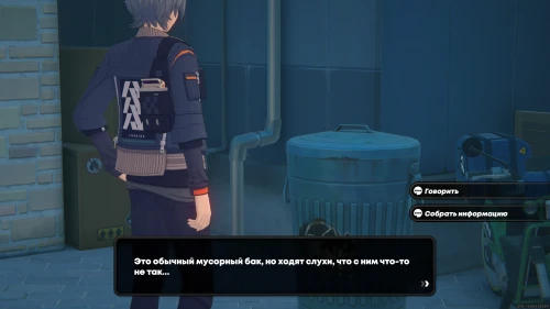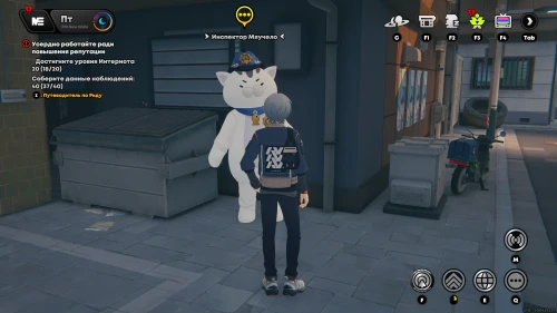 Обновите локацию и двигайтесь к Инспектору Мяучело. Слева от него стоит мусорный контейнер – взаимодействуйте с ним и достаньте из него нужный вам предмет.