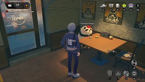 Обновите локацию, а потом бегите в кофейню справа от видеопроката. За столиком вы обнаружите мягкую игрушку Господин Панда, вокруг которой будут светиться искорки. Взаимодействуйте с ней для получения монетки.