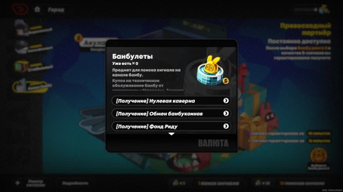 На данный момент времени это главный и единственный способ получения новых банбу в игре. Доступ к «Каналу банбу: Превосходный партнер» открывается на 16-м уровне Интернота во время выполнения «Главы 1: интермедия». Для выполнения круток в нем используются банбулеты – особая валюта, выдаваемая за прохождение Нулевой каверны, в качестве награды за события, при обмене в магазине «Реестр сигналов» и так далее. Подробнее обо всех способах можете прочитать в нашей отдельной статье.