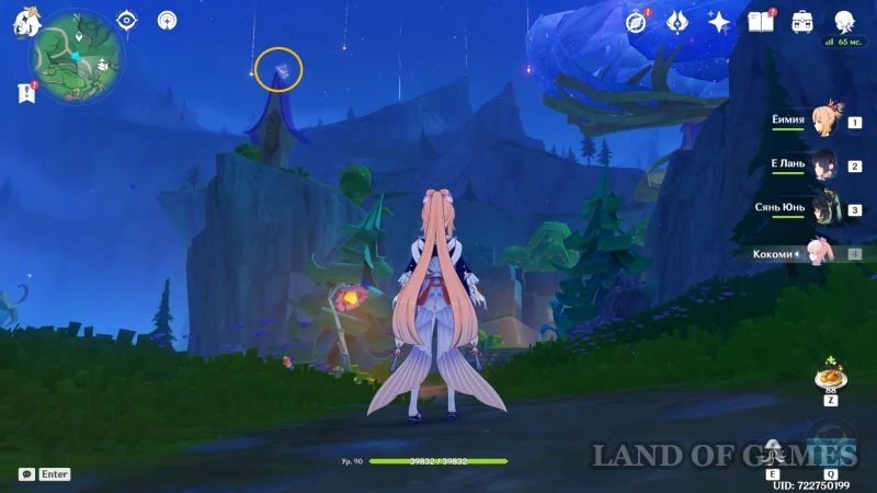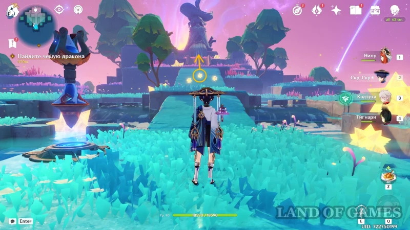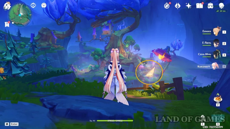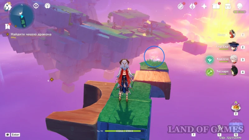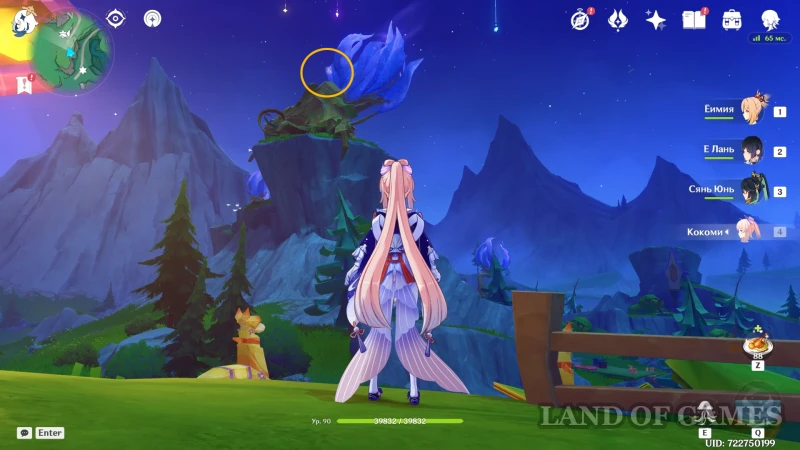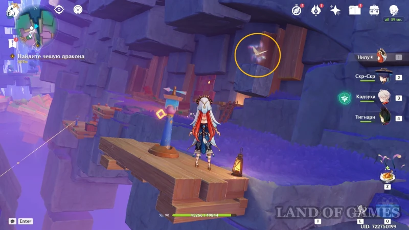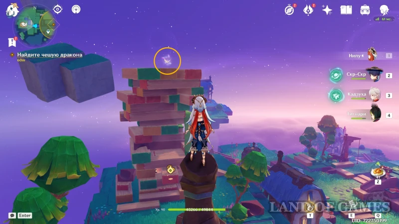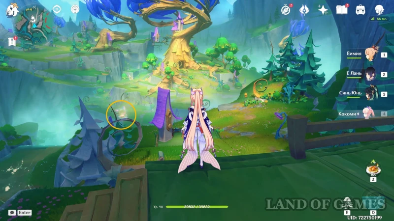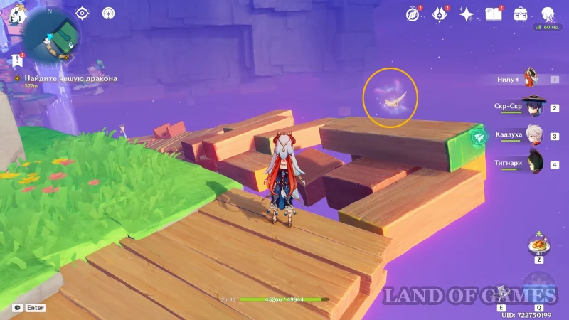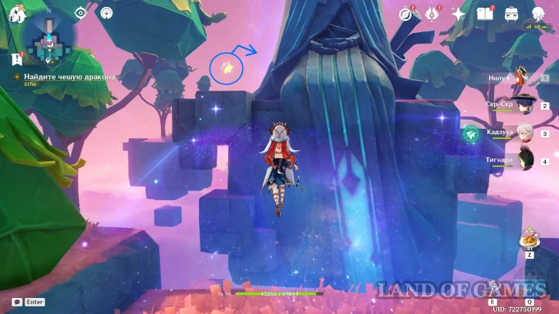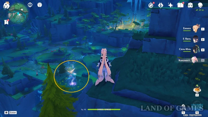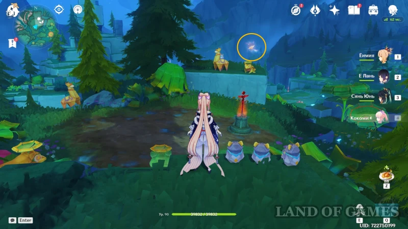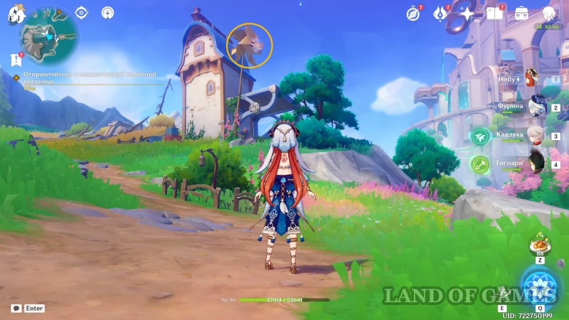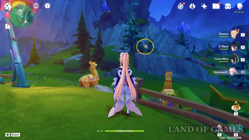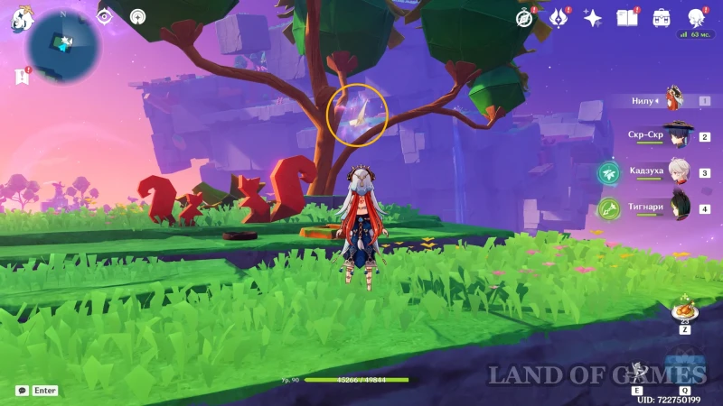 За 27-й волшебной птичкой отправляйтесь на участок земли с поваленной башней (место старта квеста «К маяку или вдаль»). Затем обойдите его и увидите полянку с волшебными существами и группой монстров из Сумеру, между которыми затесалась мерцающая диковинка.