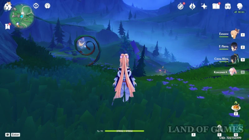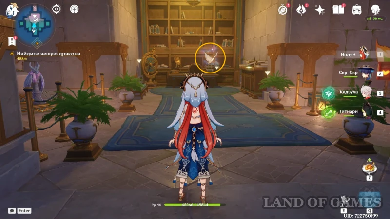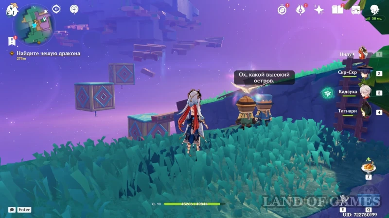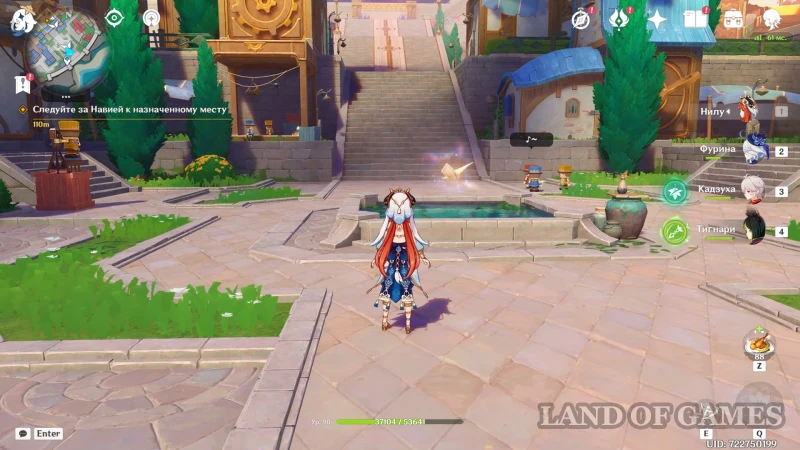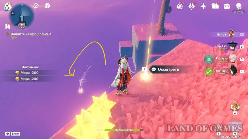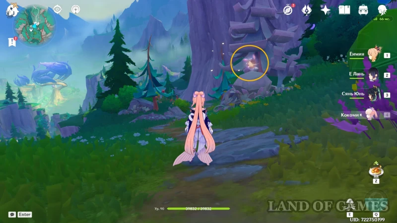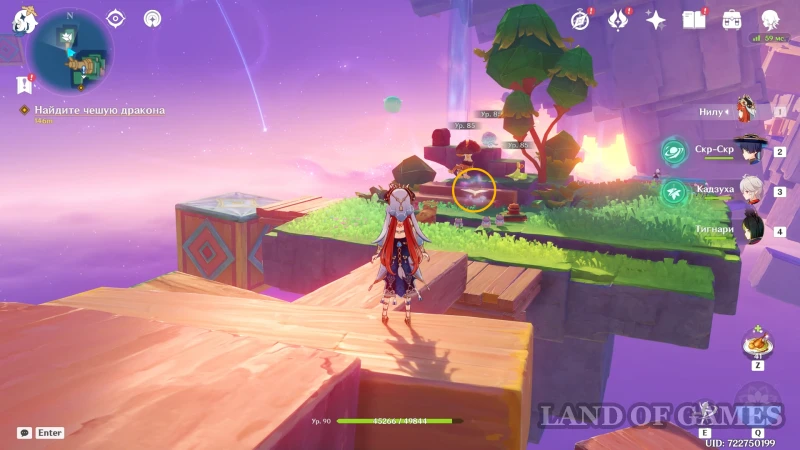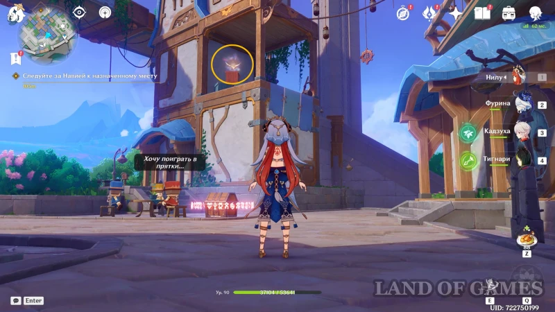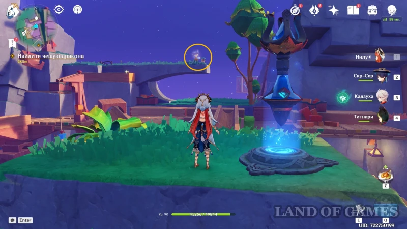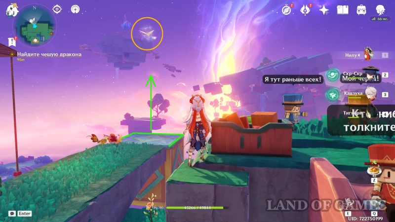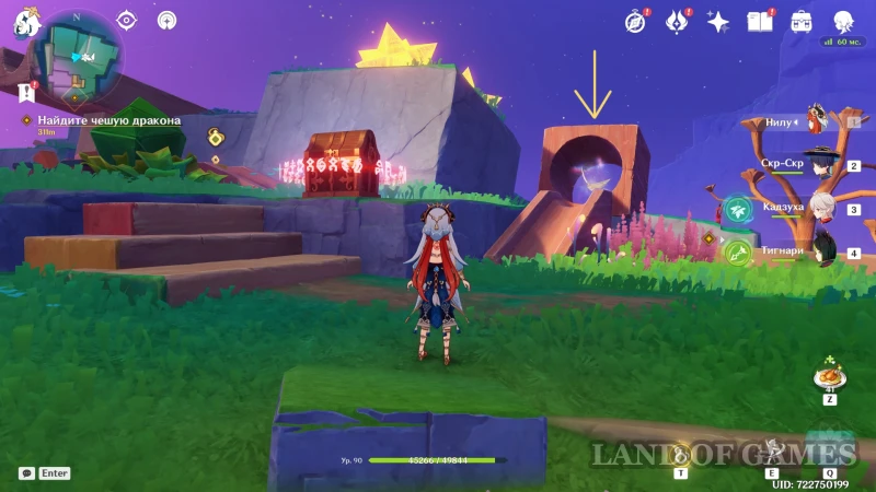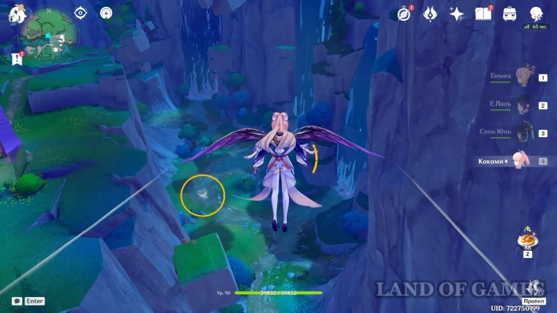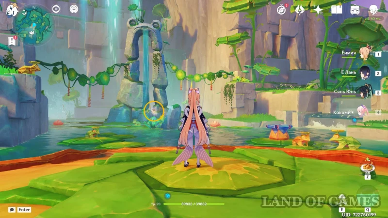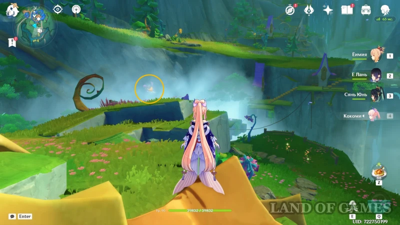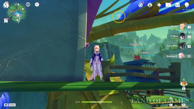 За 27-й волшебной птичкой отправляйтесь на участок земли с поваленной башней (место старта квеста «К маяку или вдаль»). Затем обойдите его и увидите полянку с волшебными существами и группой монстров из Сумеру, между которыми затесалась мерцающая диковинка.